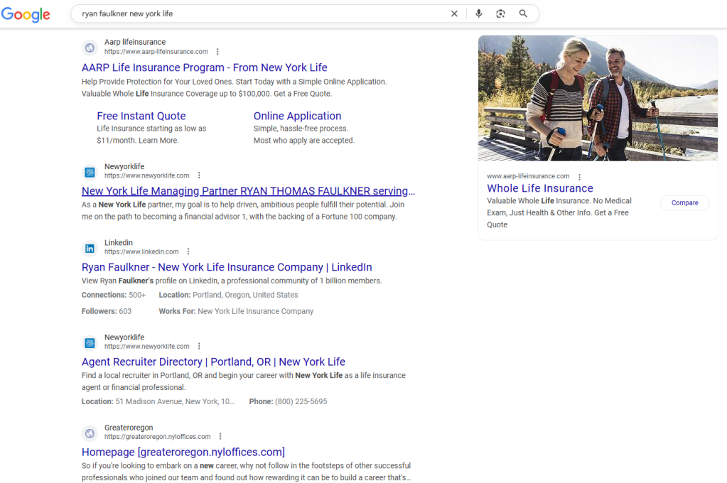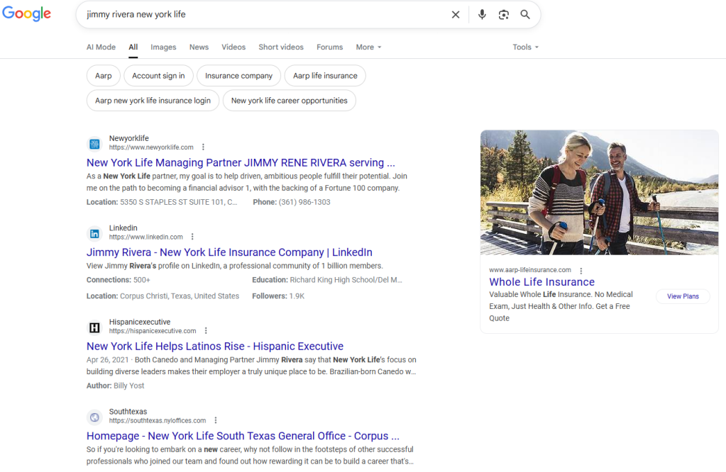 When I compared myself to peers like Ryan Faulkner and Jimmy Rivera, I found similarities. Their search results are also dominated by New York Life branding, LinkedIn, and local directories. However, Jimmy Rivera’s online presence includes interviews and features that reveal more of his personal leadership philosophy and community engagement. That subtle difference makes his digital presence feel more human, not just corporate. It made me realize that compliance does not have to mean invisibility — it simply means creativity is required.